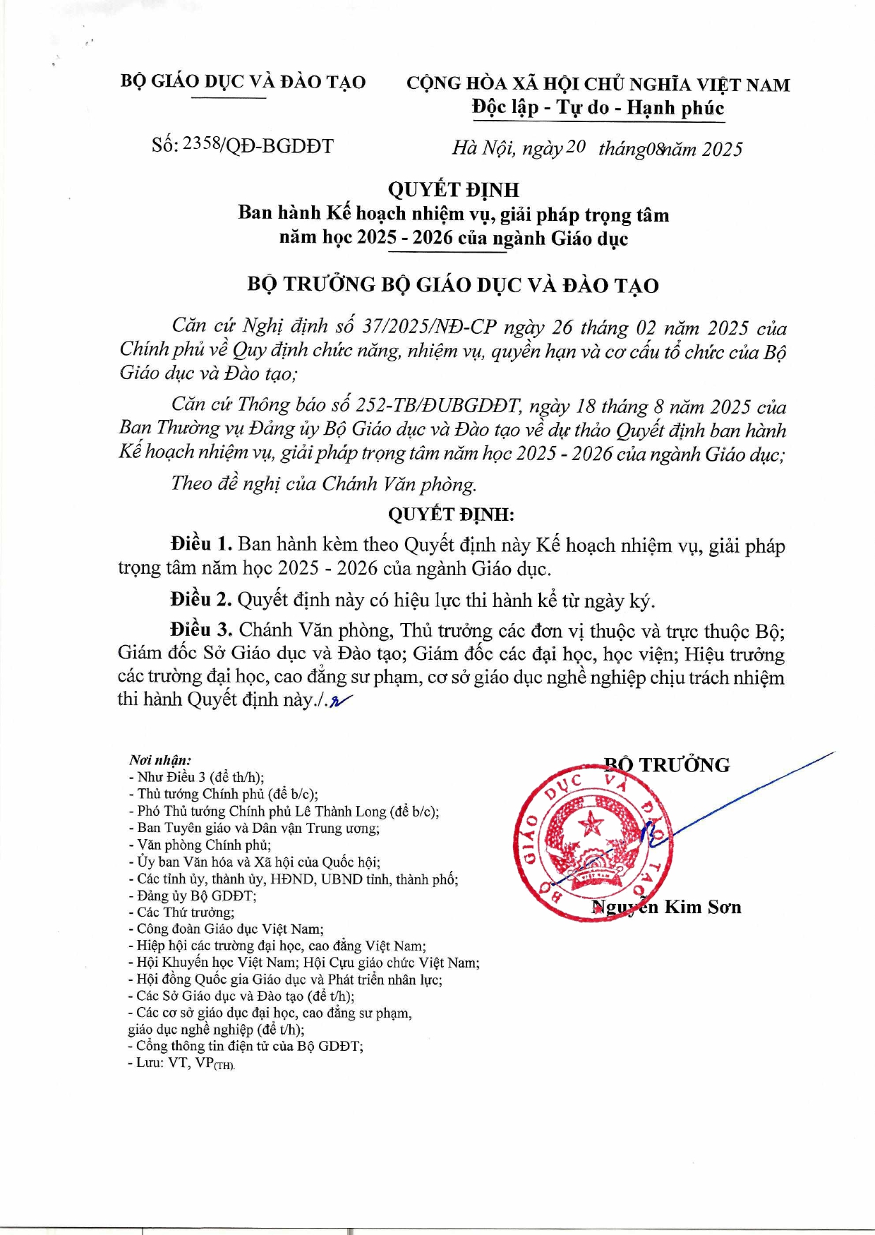 Ngày 20/8, Bộ Giáo dụcvà Đào tạo đã ban hành Kế hoạch nhiệm vụ, giải pháp trọng tâm năm học 2025 – 2026 của ngành Giáo dục.