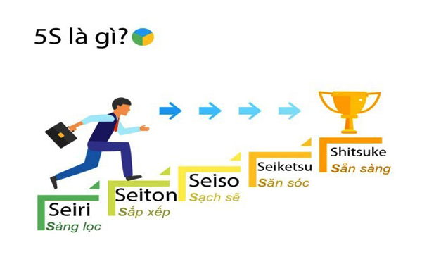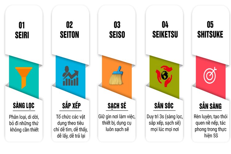 5S là viết tắt của Seiri, Seiton, Seiso, Seiketsu, Shitsuke, tạm dịch là Sàng lọc, Sắp xếp, Sạch sẽ, Săn sóc, và Sẵn sàng.