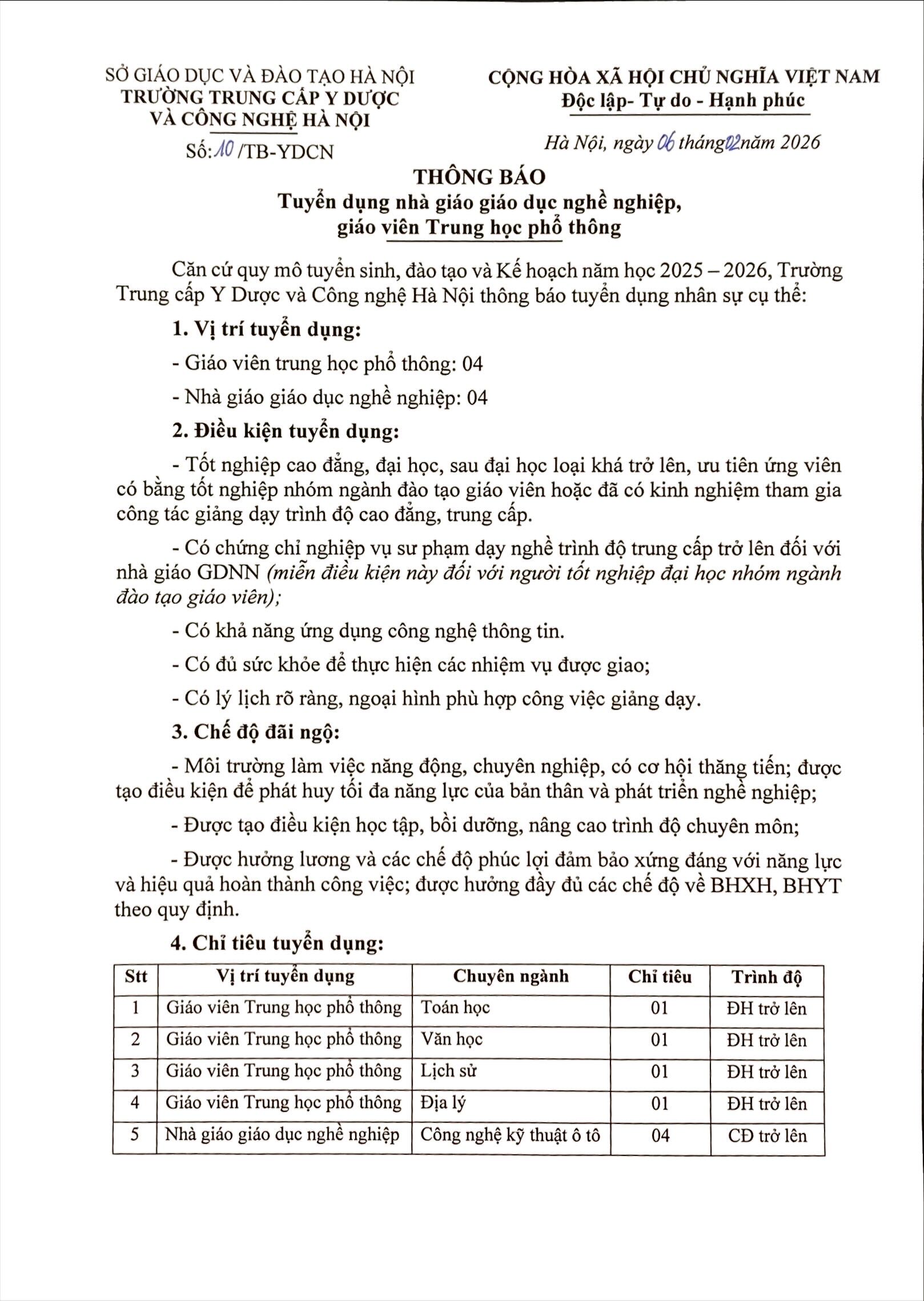 Thông báo Tuyển dụng Nhà giáo Giáo dục nghề nghiệp và Giáo viên Trung học phổ thông