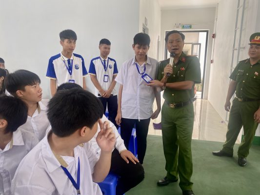 Trung tá Nguyễn Trung Thắng – Phó trưởng CAP Tùng Thiện thực hiện tuyên truyền, phổ biến kiến thức pháp luật cho học sinh của Nhà trường.