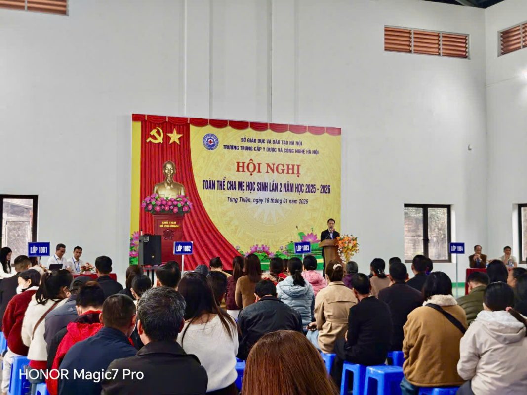 Thực hiện Kế hoạch năm học 2025 – 2026, sáng ngày 18/01/2026, Trường Trung cấp Y Dược và Công nghệ Hà Nội tổ chức Hội nghị toàn thể cha mẹ học sinh lần 2, năm học 2025 – 2026. Hội nghị được tổ chức nhằm đánh giá kết quả thực hiện nhiệm vụ giáo dục học kỳ I, đồng thời tăng cường sự phối hợp giữa Nhà trường và gia đình trong công tác giáo dục, quản lý học sinh.
